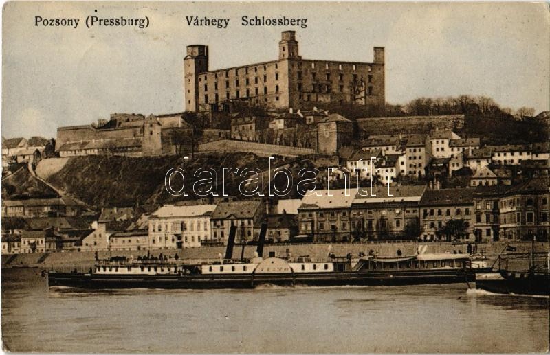 Leírás: Pozsony, Pressburg, Bratislava; Várhegy, vár, "VESTA" gyorsgőzös / Schlossberg / castle hill, castle, steamship, steamer (EK)