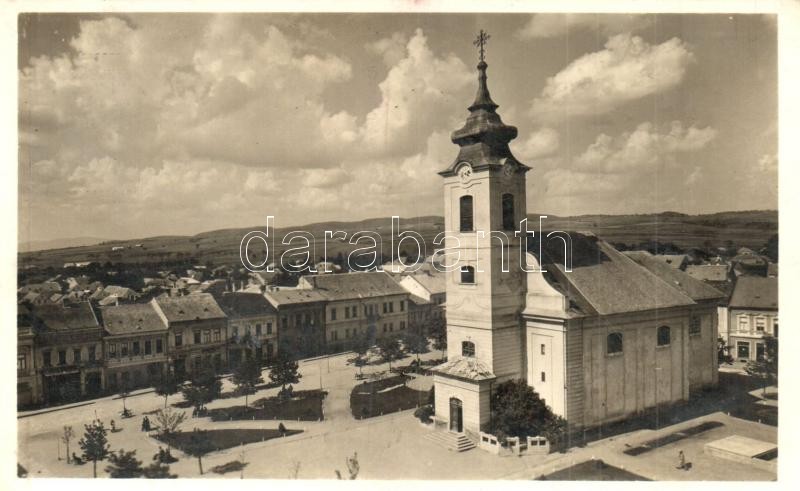 Leírás: Rimaszombat, Rimavska Sobota; Horthy Miklós tér, templom, Seidner Árpád üzlete / square, church, shops