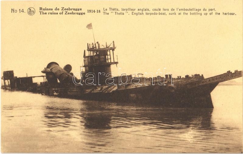 The ruins of Zeebrugge. The "Thetis" English torpedo boat, s... https://www.darabanth.com/hu/360-Gyorsarveres/360.0/Kepeslapok/Hadihajo~1000047/The-ruins-of-Zeebrugge-The-Thetis-English-torpedo-boat-sunk-at-the-bottling-up-of-the-harbour-~II2073264