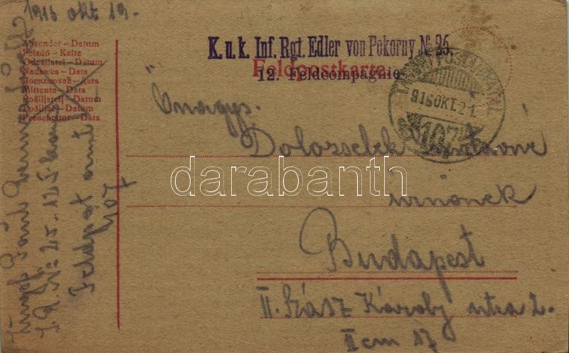 1916 Ezen a levelezőlapon mást nem szabad közölni: Egészséges vagyok és jól érzem magamat / WWI Austro-Hungarian military postcard: "The only communicable thing is: I'm healthy and I am feeling good" + "K.u.K. Inf. Rgt. Edler von Pokorny No. 25. 12. Feldcompagnie" (EK)