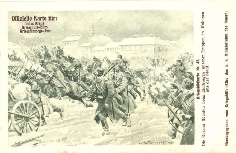 Kriegsbildkarte Nr. 49. Die Russen flüchten beim Eindringen unserer Truppen in Kolomea aus der Stadt. Kriegshilfsbüro / WWI Austro-Hungarian K.u.K. and German military art postcard, Russian troops flee from Kolomyia s: Wintorowski