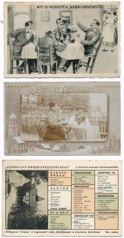3 db RÉGI képeslap: Szabadka "Elfoglalt ember levelezőlapja", Mit is mondott a kabai asszony? Újévi üdvözlő fotó / 3 pre-1945 postcards: Subotica, Kaba, New Year photo