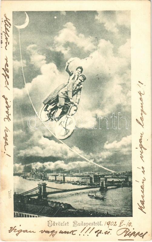 1902 Budapest, Lánchíd. Montázs kerékpáros akrobata párral, este (EK) https://www.darabanth.com/hu/360-Gyorsarveres/360.0/Kepeslapok/Magyarorszag~1000005/1902-Budapest-Lanchid-Montazs-kerekparos-akrobata-parral-este-EK~II2075153