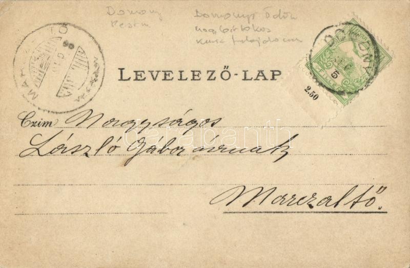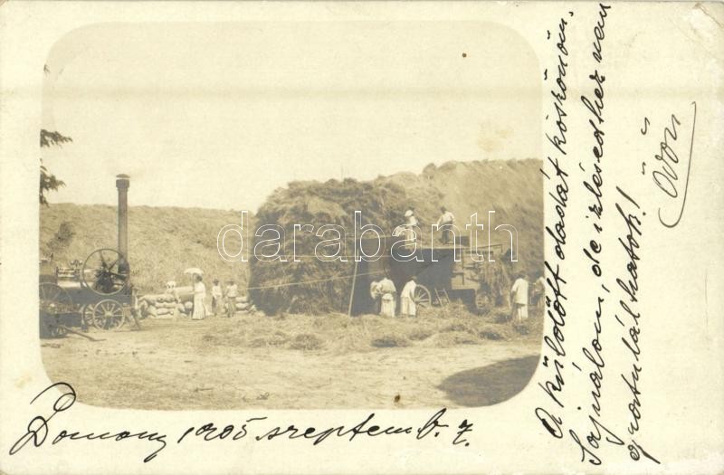 1905 Domony, mezőgazdasági munka, aratás, cséplés gőzgéppel a birtokon. "A küldött dadát köszönöm. Sajnálom, de ízlésedhez nem gratulálhatok!" - Domonyi Ödön nagybirtokos, kúria tulajdonos levele. photo (EK)