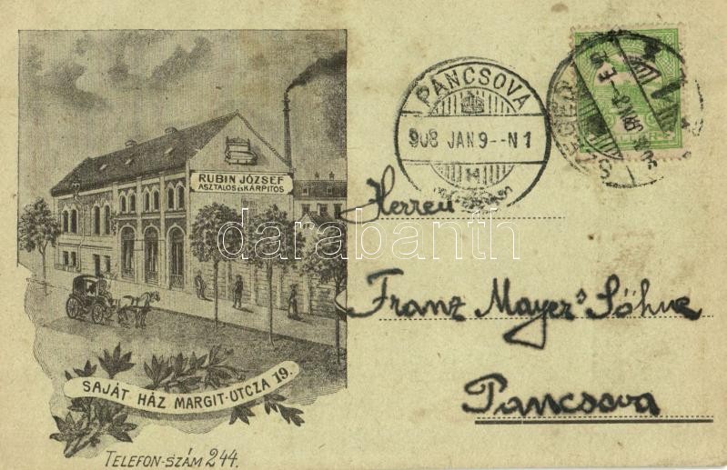 1908 Szeged, Rubin József asztalos és kárpitos műhelye, reklám. Saját ... https://www.darabanth.com/hu/360-Gyorsarveres/360.0/Kepeslapok/Magyarorszag~1000005/1908-Szeged-Rubin-Jozsef-asztalos-es-karpitos-muhelye-reklam-Sajat-haz-Margit-utca-19-flo~II2055970