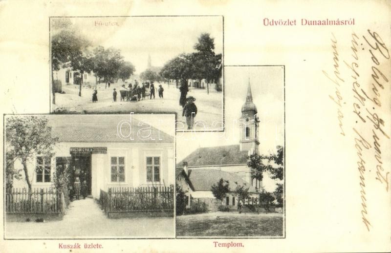 1915 Dunaalmás, Fő utca, templom, Kuszák üzlete (fl) https://www.darabanth.com/hu/360-Gyorsarveres/360.0/Kepeslapok/Magyarorszag~1000005/1915-Dunaalmas-Fo-utca-templom-Kuszak-uzlete-fl~II2055330