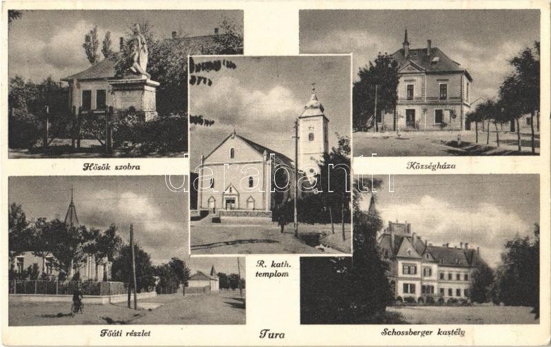 Leírás: 1937 Tura, Hősök szobra, emlékmű, Községháza, Római katolikus templom, Fő utca, kerékpáros, Schossberger kastély. Kardos Kázmérné kiadása (EK)