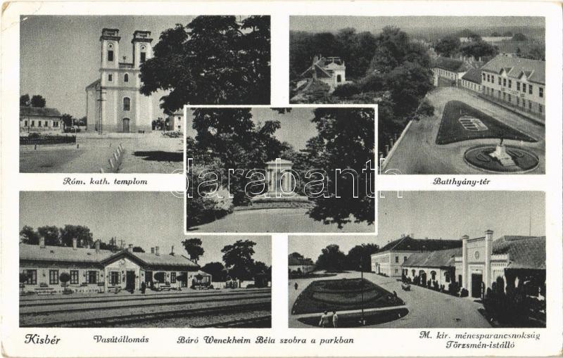 1940 Kisbér, Római katolikus templom, Batthyány tér, magyar címer, Vasútállomás, Báró Wenckheim Béla szobra a parkban, M. kir. ménesparancsnokság, Törzsmén istálló (EK)