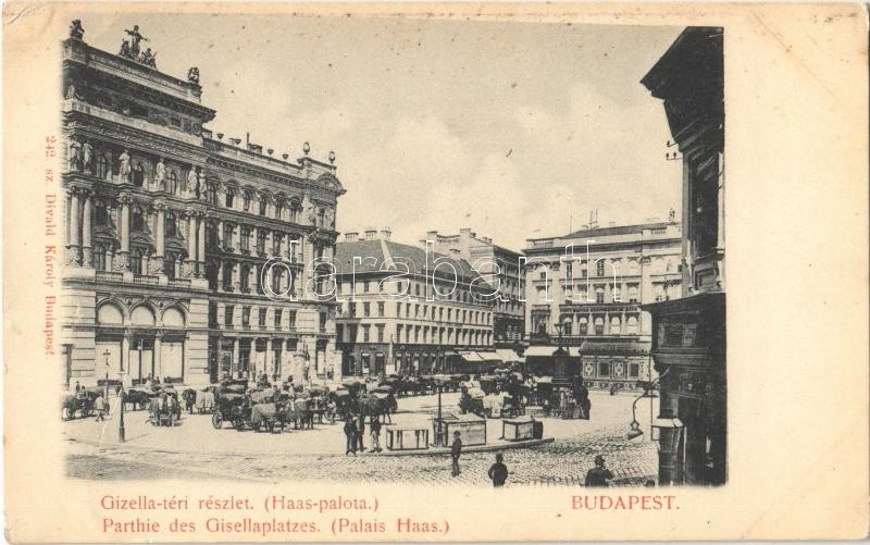 Budapest V. Gizella tér (ma Vörösmarty tér), Haas palota, piac, Pesti Magyar Kereskedelmi Bank, Szenes Ede üzlete, Magyar Király szálloda. Divald Károly 242. (EK)