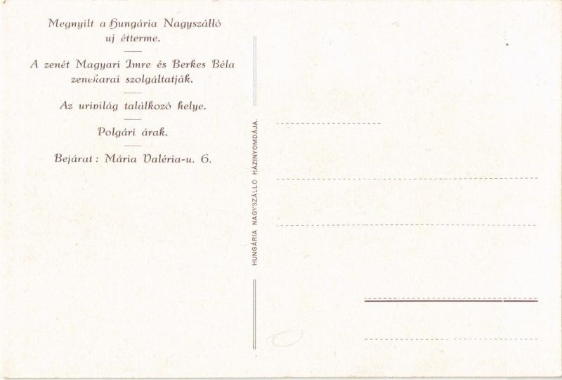 Leírás: Budapest V. Grand Hotel Hungaria Nagyszálloda grafikai reklámlapja