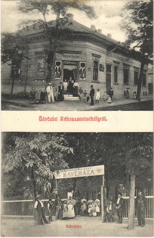 Leírás: Budapest XVI. Rákosszentmihály, Hornyok Gyuláné vegyeskereskedése, üzlet, Menartovits Lajos kávéháza, sör és borcsarnoka (fl)