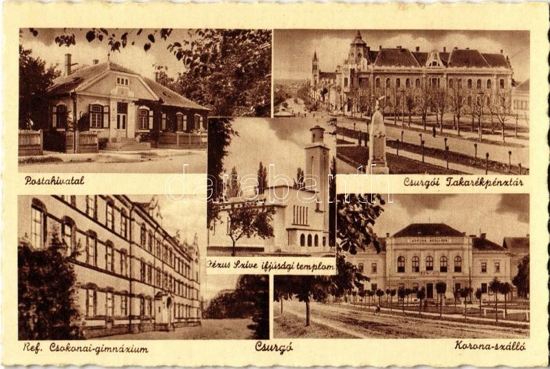 Leírás: Csurgó, Postahivatal, Csurgói Takarékpénztár, Jézus Szíve ifjúsági templom, református Csokonai gimnázium, Korona szálló
