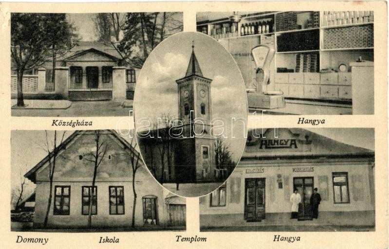 Leírás: Domony, Községháza, Római katolikus templom, Iskola, Hangya szövetkezet üzlete, külső és belső nézet. Kiadja a Hangya