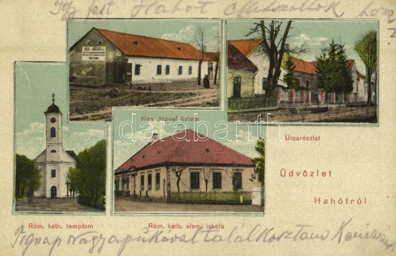 Leírás: Hahót, Római katolikus templom és elemi iskola, Kiss József üzlete, utcakép. Kálmán fényirda kiadása (EK)