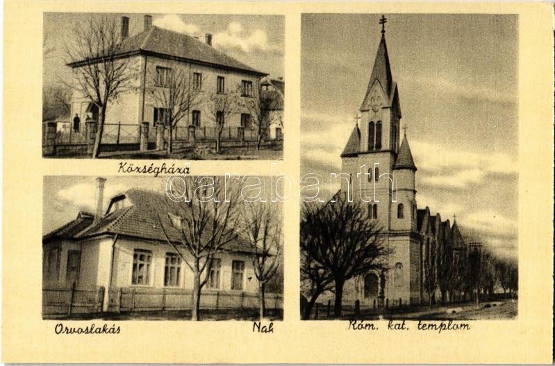 Leírás: Nak, Községháza, orvoslakás, római katolikus templom