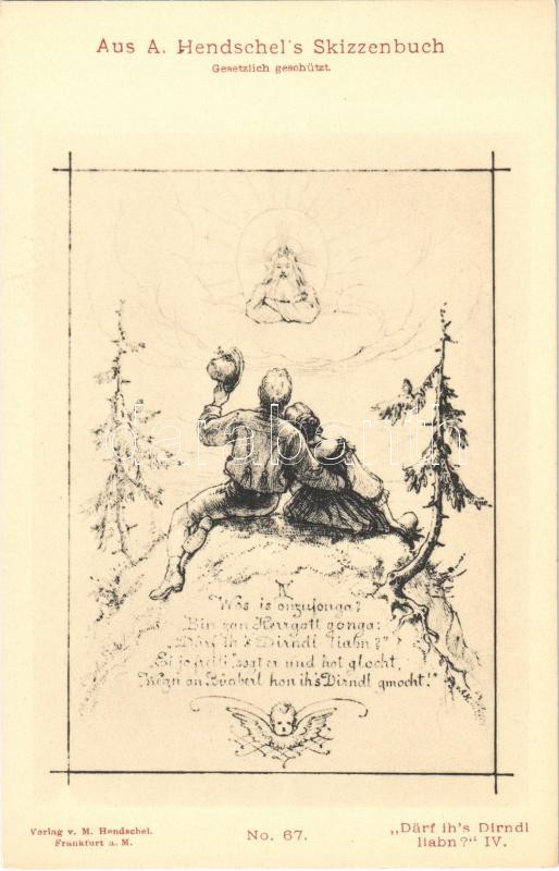 Leírás: "Darf ih's Dirndl liabn?" IV., Aus A. Hendschel's Skizzenbuch No. 67., Verlag v. M. Hendschel / romantic couple