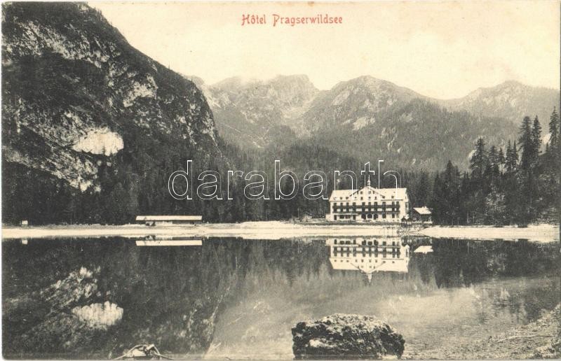 1906 Lago di Braies, Pragser Wildsee (Südtirol); Hotel Pragserwildsee https://www.darabanth.com/hu/360-Gyorsarveres/360.0/Kepeslapok/Olaszorszag~1000075/1906-Lago-di-Braies-Pragser-Wildsee-Sudtirol-Hotel-Pragserwildsee~II2076188