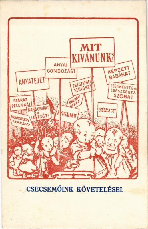 Csecsemőink követelései. Kiadja az Országos Stefánia Szövetség az anyák és csecsemők védelmére / Hungarian propaganda postcard, Mother and child protective movement