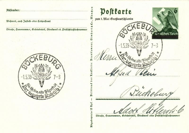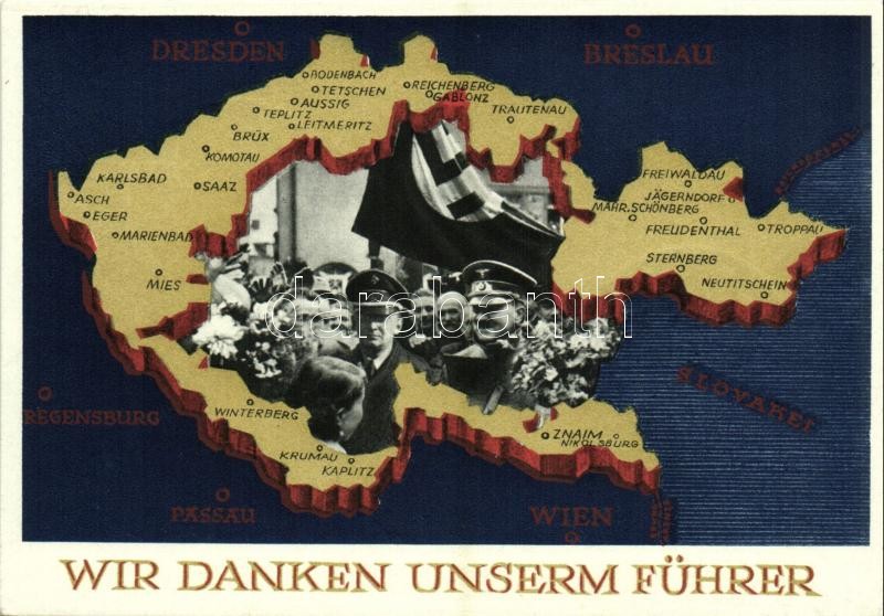 Wir danken unserm Führer / NSDAP German Nazi Party propaganda, Adolf Hitler, Konrad Henlein, map of the Czech Republic, swastika. 6 Ga. + "1939 Bückerburg" So. Stpl