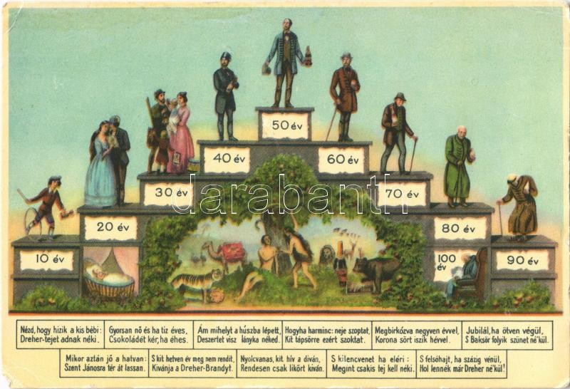 "Életünket végig Dreher-márkák védik", humoros reklámlap, Klösz Gy. és Fia kiadása / Dreher alcoholic drinks advertisement, humour (15 cm x 10,2 cm) (EK)