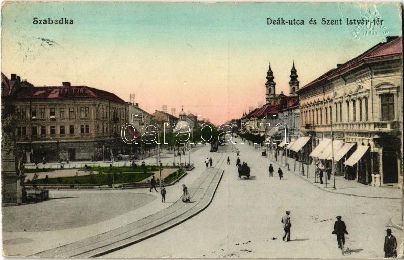 1914 Szabadka, Subotica; Deák utca és Szent István tér, üzletek, villa... https://www.darabanth.com/hu/360-Gyorsarveres/360.0/Kepeslapok/Vajdasag~1000011/1914-Szabadka-Subotica-Deak-utca-es-Szent-Istvan-ter-uzletek-villamossin-Kiadja-Lipsitz-~II2033811
