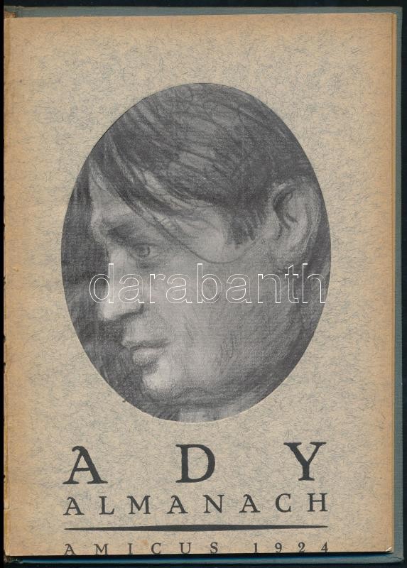 Ady Almanach. Bp., 1924, Amicus,(Globus-ny.), 46+2 p. + 3 t. (Rippl-Rónai József Ady portréi.) A kötetben Juhász Gyula, Ady Lajos, Rippl-Rónai József, Földessy Gyula és Dutka Ákos Adyról szóló írásai találhatók, valamint az Amicus kiadó könyvjegyzéke, gazdagon illusztrálva. Átkötött egészvászon-kötés, körbevágott, egyébként jó állapotban.