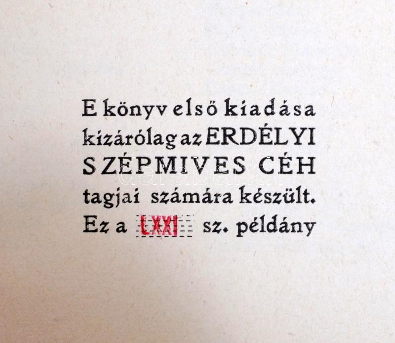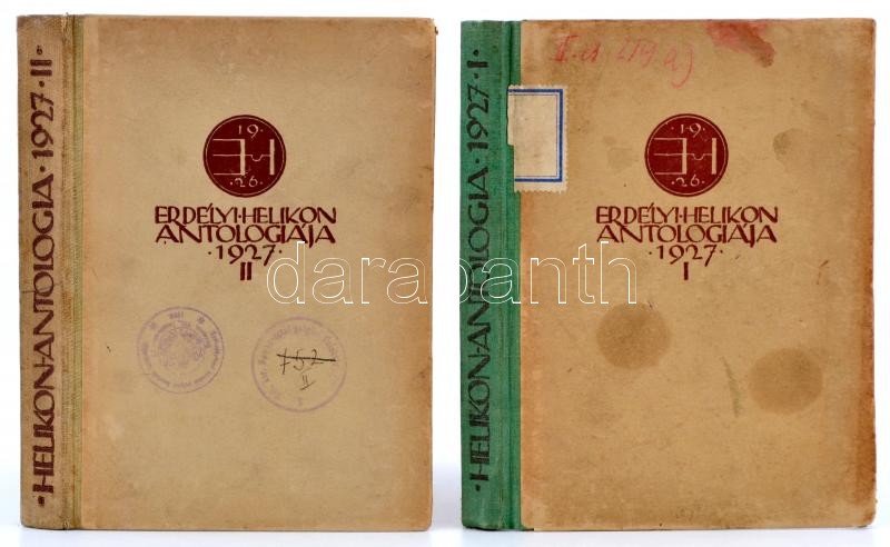 Erdélyi Helikon antológiája 1927 I-II. kötet. Bánffy Miklós és Kós Károly illusztrációval. Kolozsvár, 1927, Erdélyi Szépmíves Céh,(Lapkiadó-ny.), 172+2 p.+ 4 t.+176+6+VI p. Első kiadás. Kiadói félvászon-kötés, kissé kopott, kissé foltos borítóval, intézményi bélyegzőkkel. A II. kötet számozott, 71. (LXXI.) számú példány.