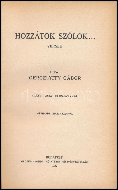 Gergelyffy Gábor: Hozzátok szólok... Versek. Rákosi Jenő előszavával. ... https://www.darabanth.com/hu/360-Gyorsarveres/360.0/Konyvek/Konyvek-Egyeb-ritkasagok~1500020/Gergelyffy-Gabor-Hozzatok-szolok-Versek-Rakosi-Jeno-eloszavaval-Gebhardt-Tibor-rajzaiva~II1994773