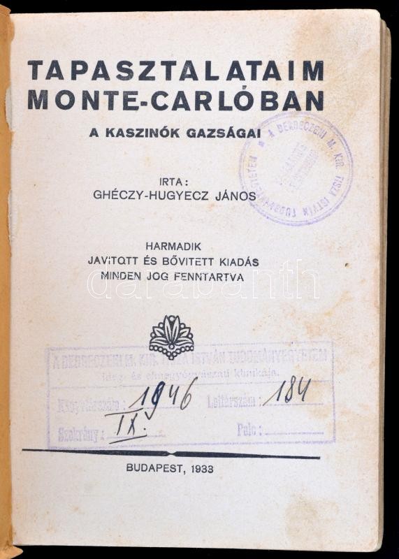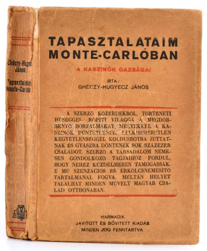 Ghéczy-Hugyecz János: Tapasztalataim Monte-Carlóban. A kaszinók gazságai. Bp.,1933, Hollóssy János-ny., 143+1 p. JavÃtott és bÅ‘vÃtett kiadás. Kiadói papÃrkötés, javÃtott, kissé sérült gerinccel.