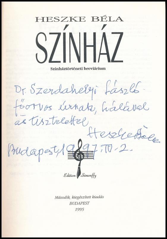 Leírás: Heszke Béla: Színház. Színháztörténeti breviárium. Bp., 1995, Simonffy. Második, kiegészített kiadás. Kiadói papírkötés. A szerző által dedikált.