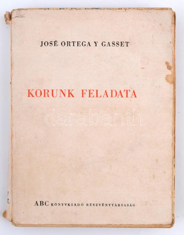 José Ortega Y Gasset: Korunk feladata. Bp.,1944,ABC. Kiadói papírkötés, a könyvtest elvált a borítótól, és fűzés kissé sérült, pár lap elvált a könyvtesttől, a borító kissé szakadozott, lapszéli folttal.