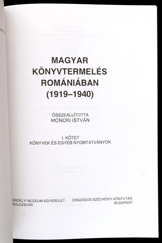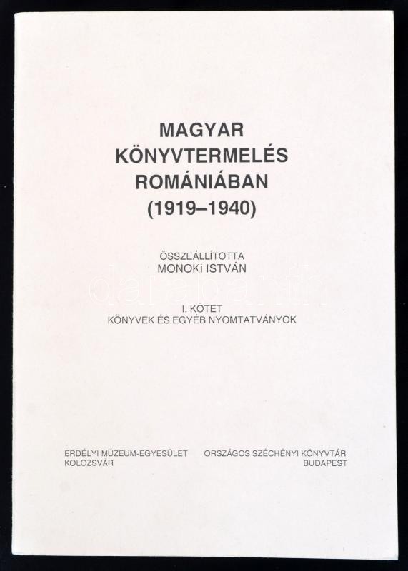 Magyar könyvtermelés Romániában. (1919-1940.) I. köt.: Könyvek és egyéb nyomtatványok. Összeáll.: Monoki István. Kolozsvár-Bp.,1997,Erdélyi Múzeum Egyesület-OSZK. Kiadói papírkötés.