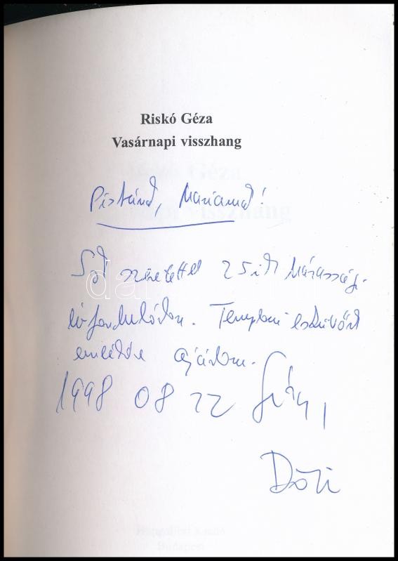 Riskó Géza: Vasárnapi visszhang. Bp.,[1998],Hungalibri. Kiadói papírkö... https://www.darabanth.com/hu/360-Gyorsarveres/360.0/Konyvek/Konyvek-Egyeb-ritkasagok~1500020/Risko-Geza-Vasarnapi-visszhang-Bp-1998-Hungalibri-Kiadoi-papirkotes-A-szerzo-altal-d~II2069877