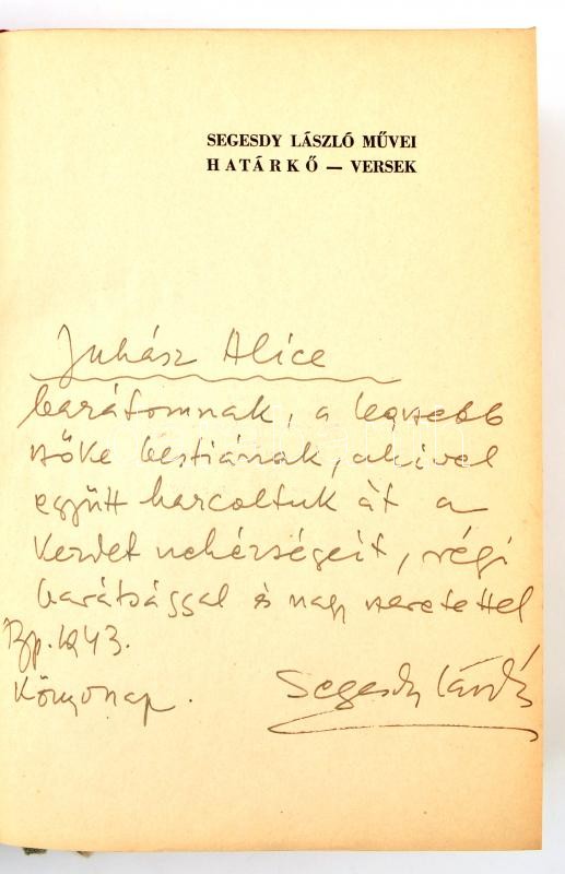 Segesdy László: Határkő. Kiválasztott - régi és új versek. Bp.,1943, Bíbor Könyvkiadó. Kiadói félvászon-kötés, aranyozott felső lapélekkel, kopottas borítóval. A leírás szerint számozott példány félbőr kötésben, de valójában félvászon-kötés.