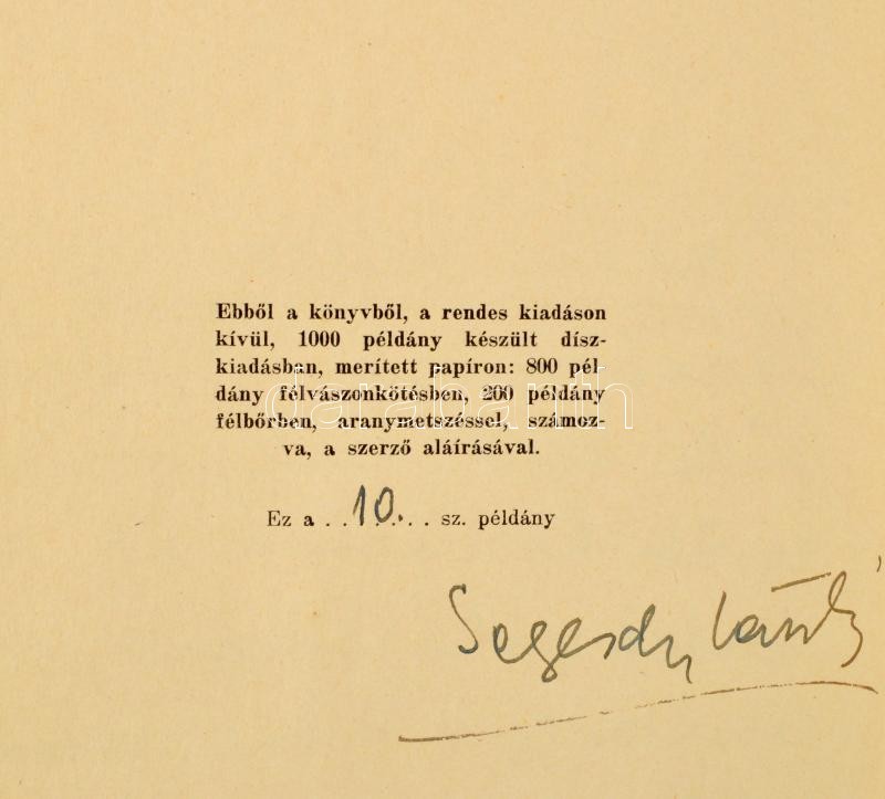Számozott (800/10.) példány. A szerző, Segesdy László (1899-1975) forgatókönyv- és dalszövegíró által aláírt, és dedikált példány.