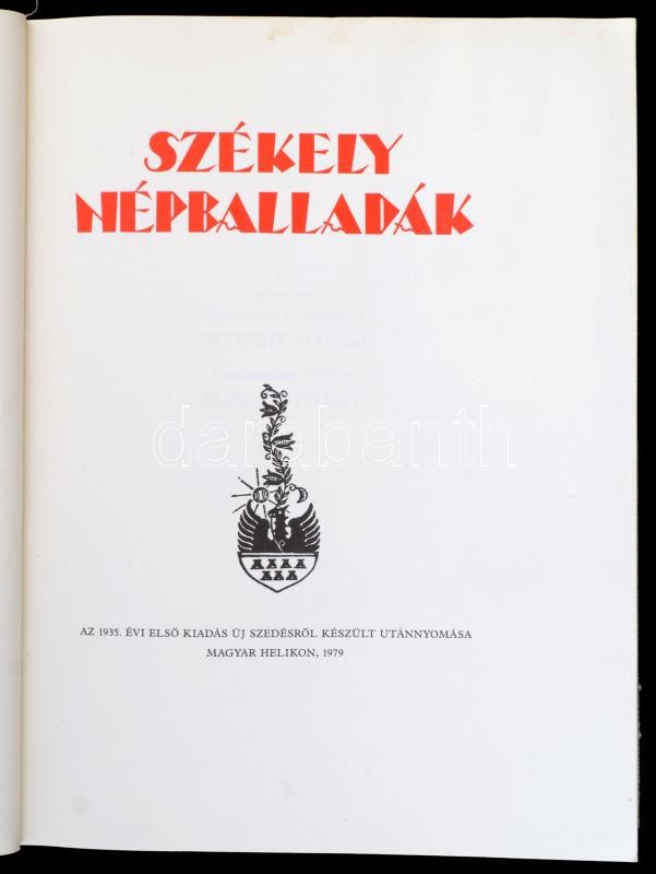 Székely népballadák. Összeállította és magyarázta: Ortutay Gyula. Buday György illusztrációival. Bp.,1979, Magyar Helikon. Kiadói egészvászon-kötés, kissé kopott borítóval, kissé foltos lapszélekkel.