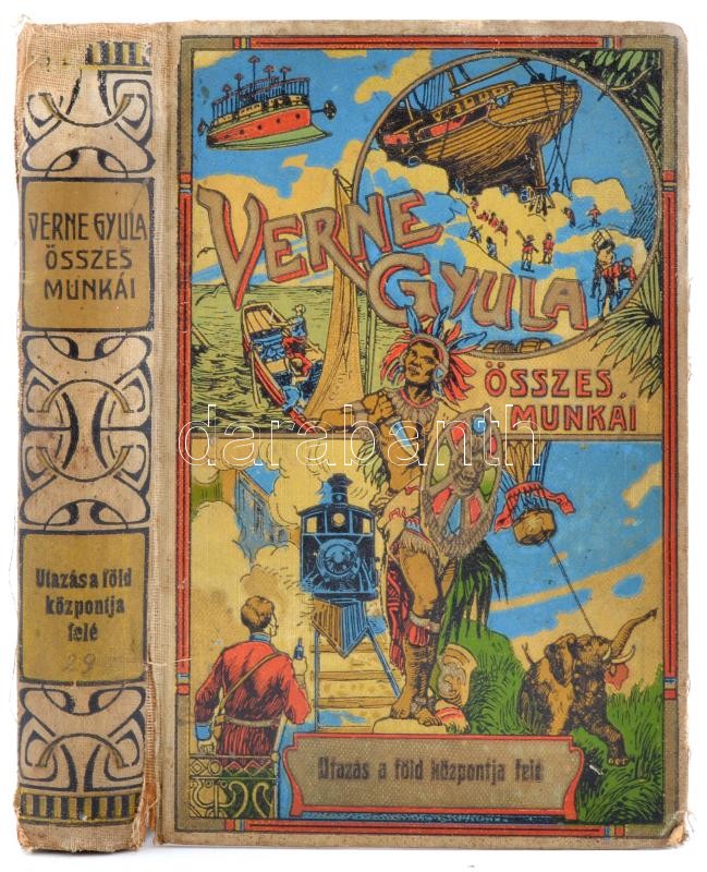 Leírás: Verne Gyula: Utazás a föld középpontja felé. Ford.: Kürthy Emilné. Geiger Richárd rajzaival. Bp., é.n., Magyar Kereskedelmi Közlöny, ("Globus"-ny.), 175+1 p. Kiadói aranyozott, festett, illusztrált egészvászon-kötés, kopott, foltos borítóval, sérült gerinccel.