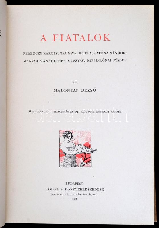 Malonyay Dezső: A fiatalok. Ferenczy Károly, Grünwald Béla, Katona Nándor, Magyar-Mannheimer Gusztáv, Rippl-Rónai József. Művészeti könyvtár. Bp.,1906, Lampel R. (Wodianer F. és Fiai.), 224 p.+16 t.+ 3 hasonmás. Szövegközti és egészoldalas képekkel gazdagon illusztrált. Kiadói szecessziós aranyozott, illusztrált félvászon-kötés, apró kopásnyomokkal a borítón, de alapvetően jó állapotban.