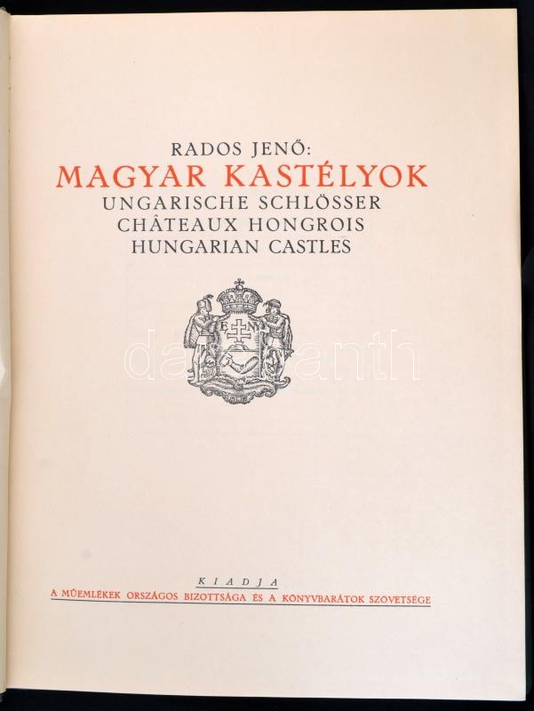 Leírás: Rados Jenő: Magyar kastélyok. Ungarische Schlösser. Châteaux hongrois. Hungarian Castles. Bp., 1931, Műemlékek Országos Bizottsága - Könyvbarátok Szövetsége. Fekete-fehér fotókkal, és szövegközti illusztrációkkal. Kiadói aranyozott egészvászon-kötés, kissé kopott borítóval.