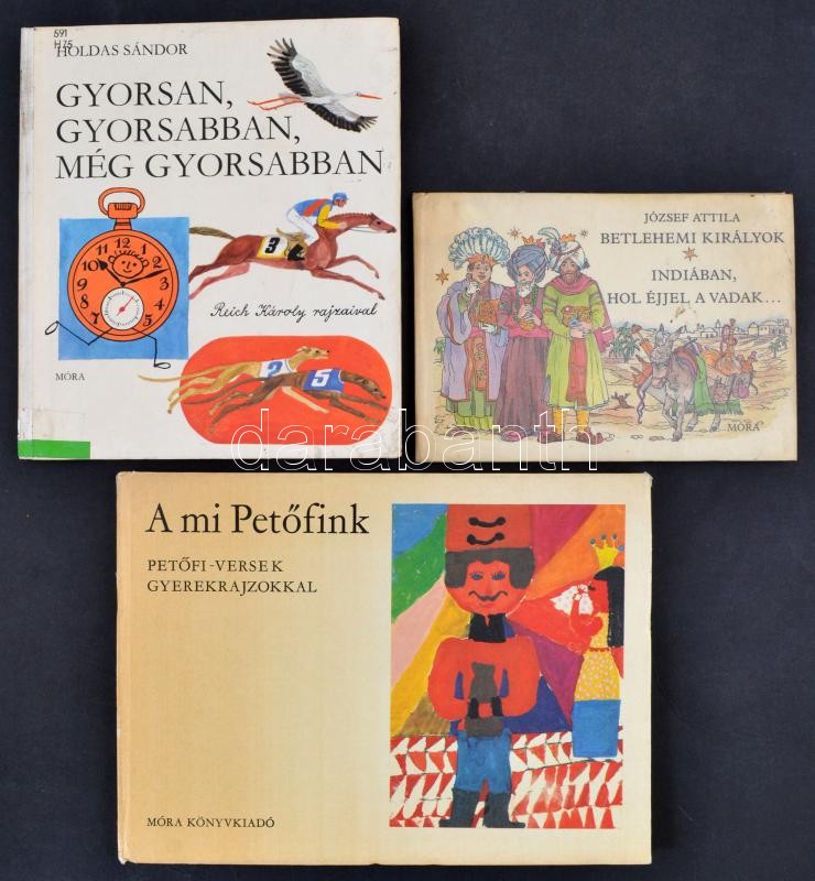 3 db mesekönyv: József Attila: Betlehemi királyok, Indiában hol éjjel a vadak, Holdas Sándor: Gyorsabban, gyorsabban, még gyorsabban; A mi Petőfink. Petőfi versek gyermekrajzokkal