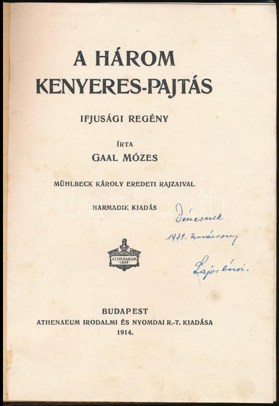 Gaal Mózes: A három kenyeres-pajtás. Mühlbeck Károly eredeti rajzaival. Bp., 1914, Athenaeum, 101+3 p. Harmadik kiadás. Kiadói aranyozott, festett, illusztrált egészvászon-kötés, kissé kopott borítóval.