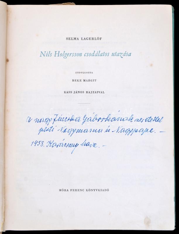 Leírás: Selma Lagerlöf: Nils Holgersson csodálatos kalandjai. Átdolgozta Beke Margit. Kass János rajzaival. Bp.,1958,Móra. Kiadói félvászon-kötés, kissé kopott borítóval.