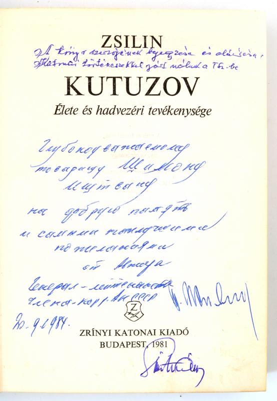 Zsilin: Kutuzov. Élet és hadvezéri tevékenysége. Bp., 1981, Zrínyi. Kiadói egészvászon-kötés, kiadói szakadt papír védőborítóban. A szerző, P. A. Zsilin orosz nyelvű dedikációjával, dátumozva.+Az ászári TSZ elnök bejegyzésével és aláírásával.