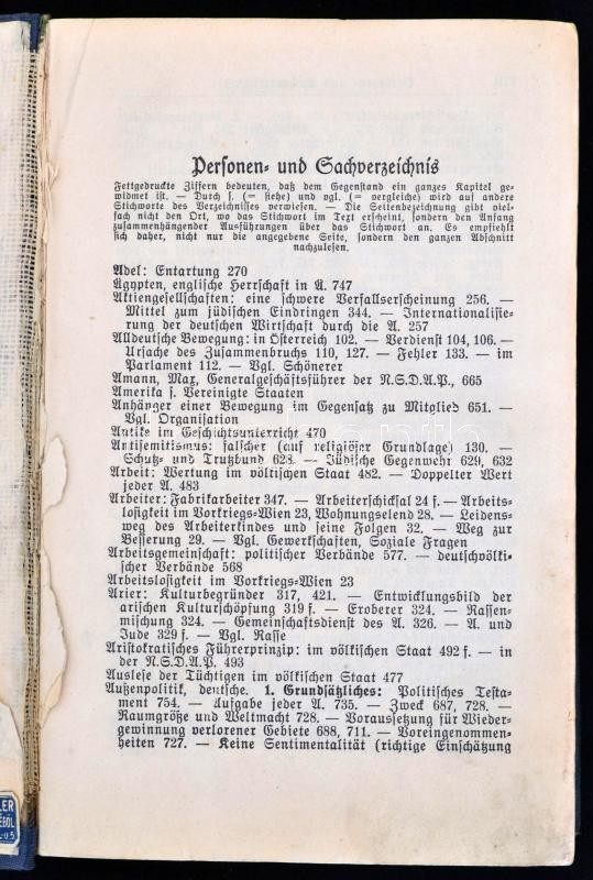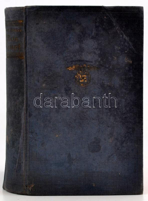 Adolf Hitler: Mein Kampf. Zwei Bände in einem Band. Ungekürzte Aufgabe. München,é.n., Zentralverlag der NSDAP, Fr. Eher Nachf, VII-XXVI+6+781+11 p. Német nyelven. Kiadói aranyozott, fekete egészvászon-kötés, kopott borítóval, pár lap hiányzik az elejéről, közte a címkép és a címlap.