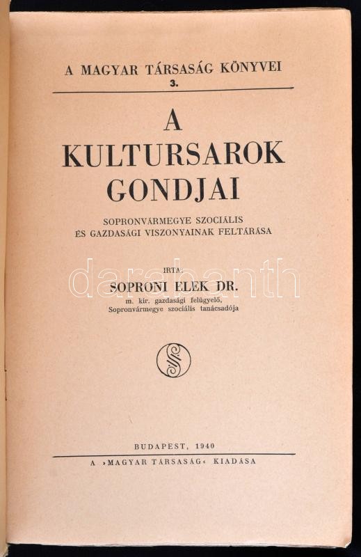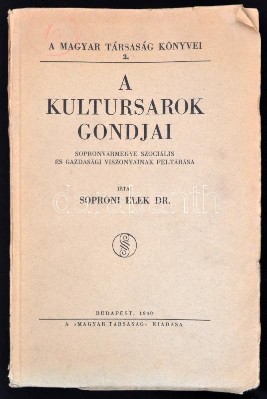 Dr. Soproni Elek: A kultúrsarok gondjai. Sopron vármegye szociális és gazdasági viszonyainak feltárása. Bp., 1940, Magyar Társaság. Kiadói papírkötés, kissé kopottas állapotban.
