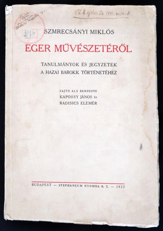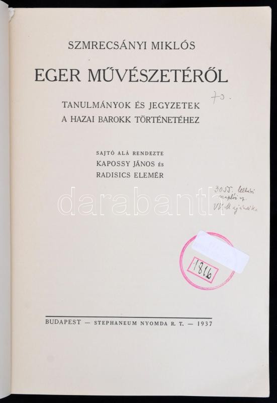 Szmrecsányi Miklós: Eger művészetéről. Tanulmányok és jegyzetek a hazai barokk történetéhez. Sajtó alá rendezte Kapossy János és Radisics Elemér. Bp., 1937, Stephaneum. Fekete-fehér fotókkal illusztrált. Kiadói papírkötés, foltos, gyűrött borítóval, intézményi bélyegzőkkel.