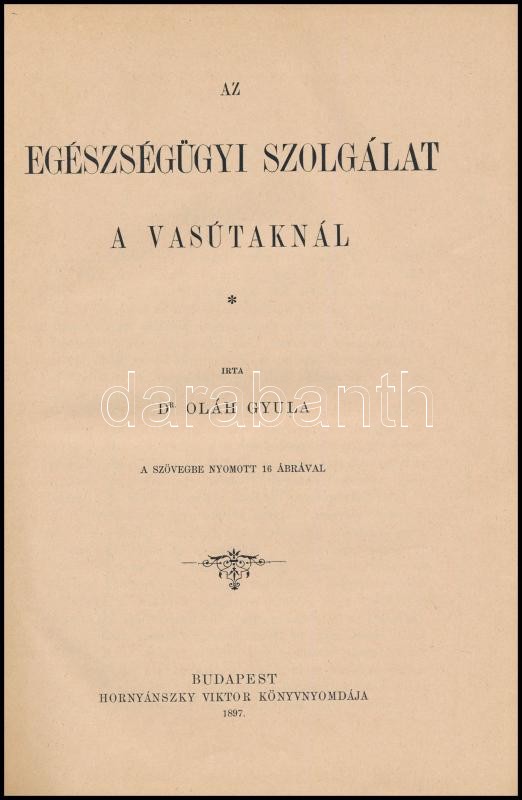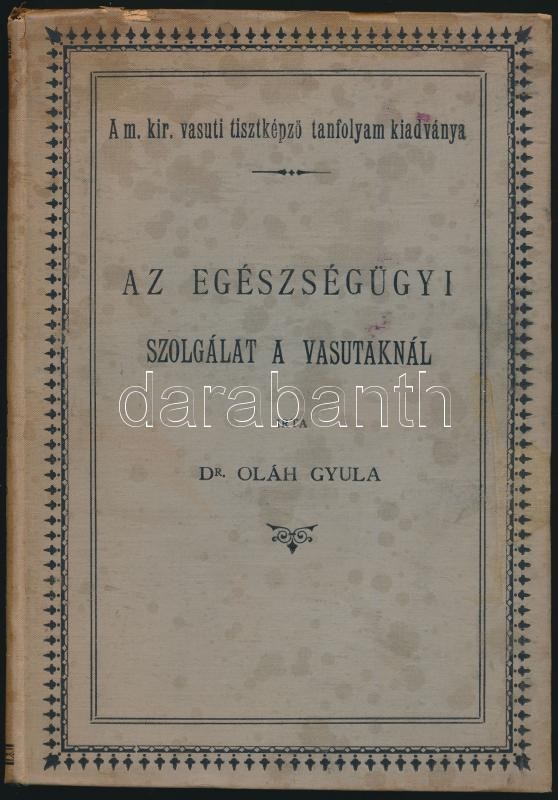 Dr. Oláh Gyula: Az egészségügyi szolgálat a vasutaknál. Bp.,1897, Hornyánszky Viktor-ny., 255 p. Kiadói festett egészvászon-kötés, Leszik-kötés, foltos, kissé kopott borítóval, kissé sérült gerinccel.