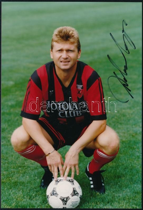 Leírás: Détári Lajos (1963-) labdarúgó aláírása egy őt ábrázoló fotón, 15x10 cm