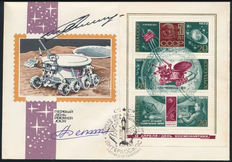 Gennagyij Szarafanov (1942-2005) és Lev Gyomin (1926-1998) szovjet űrhajósok aláírásai emlékborítékon / Signatures of Gennadiy Sarafanov (1942-2005) and Lev Dyomin (1926-1998) Soviet astronauts on envelope
