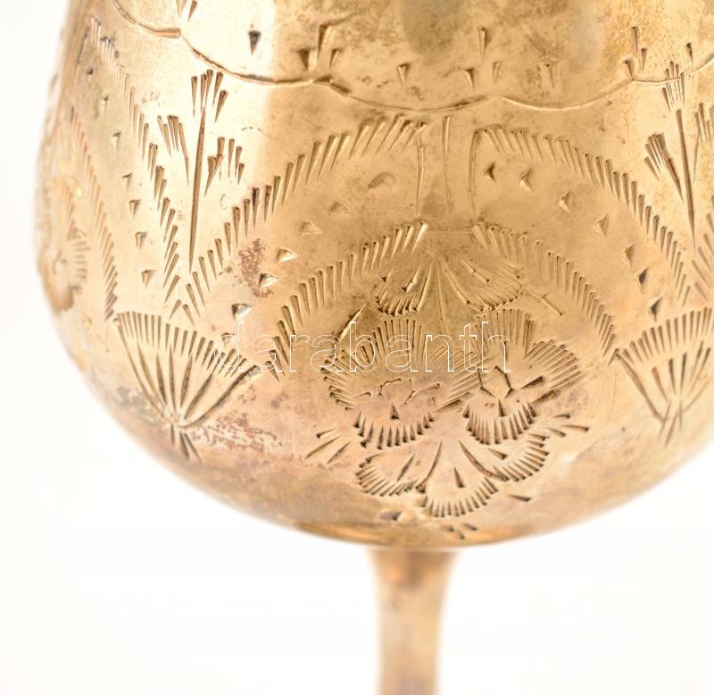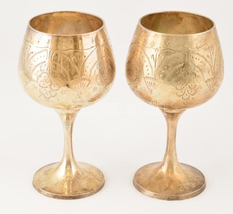 Leírás: Ezüstözött alpakka boros pohár (2 db), gravírozott mintákkal, m:15,5 cm (2×)